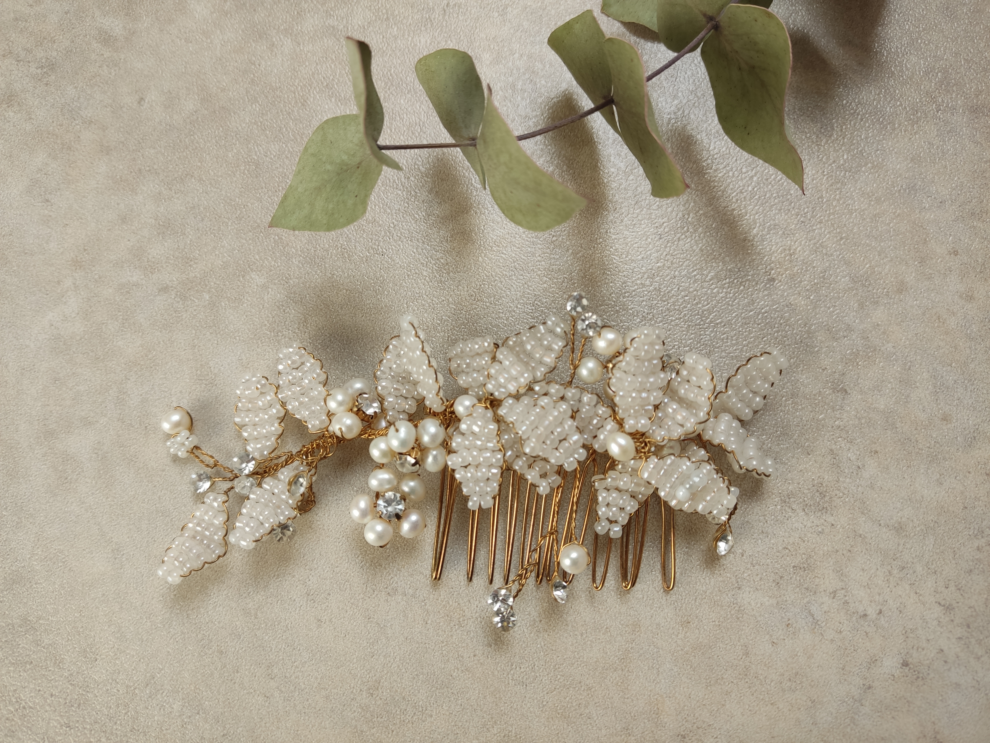 Haarschmuck in gold mit Perlenblumen und Glitzersteine